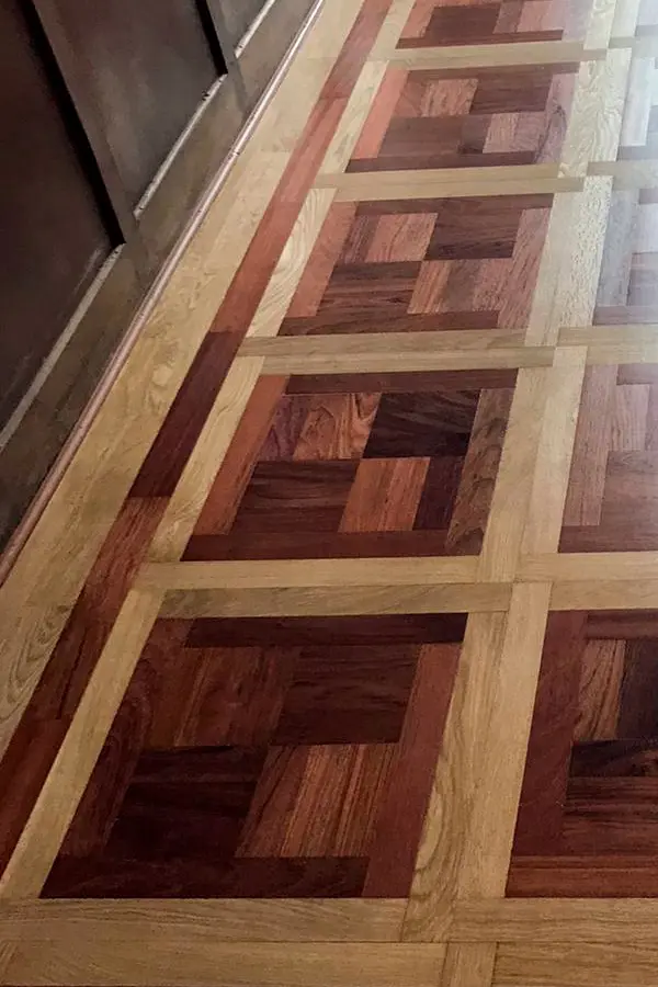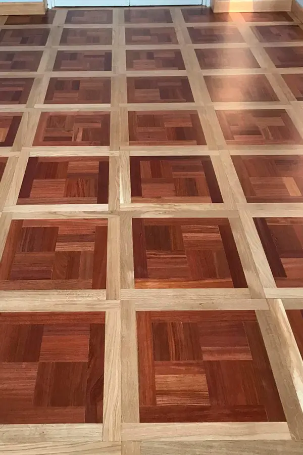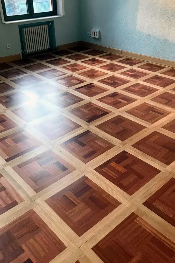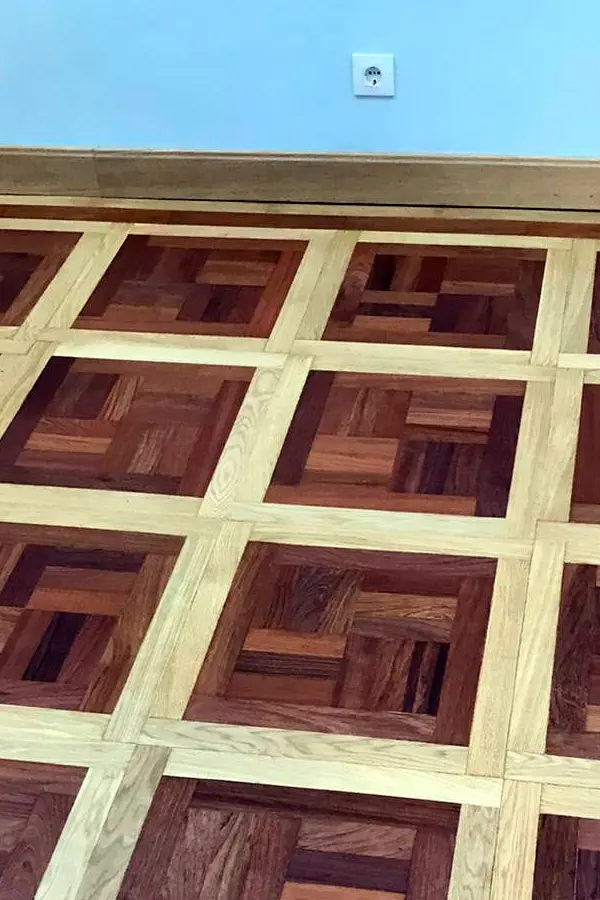 Proyecto de reproducción de dibujo en tarima maciza de jatoba y roble en edificio protegido por patrimonio. Se ejecutó una réplica fiel del diseño original, respetando la geometría, disposición y combinación de maderas, garantizando un resultado acorde a los requisitos de conservación y al valor histórico del espacio.